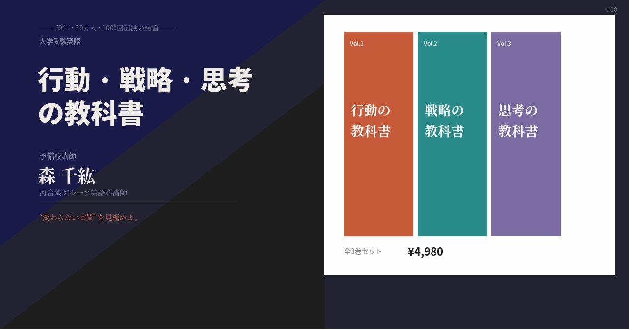 河合塾グループを中心に活動するフリーの予備校講師。中1から高卒生まで全学年・全レベルを担当する。受験英語指導歴は20年以上。映像講義の受講生を含め、実数で20万人以上の生徒と向き合ってきた。